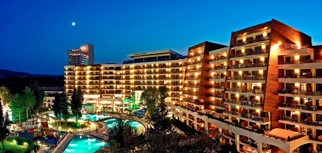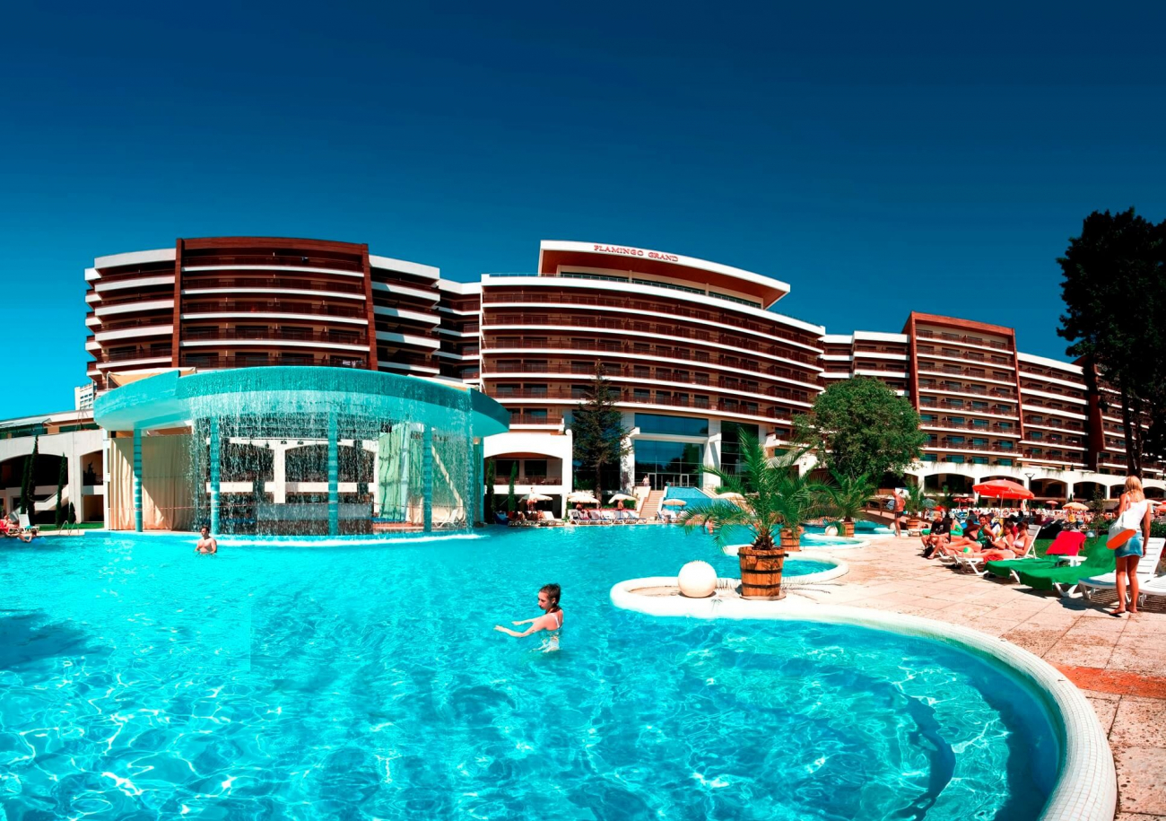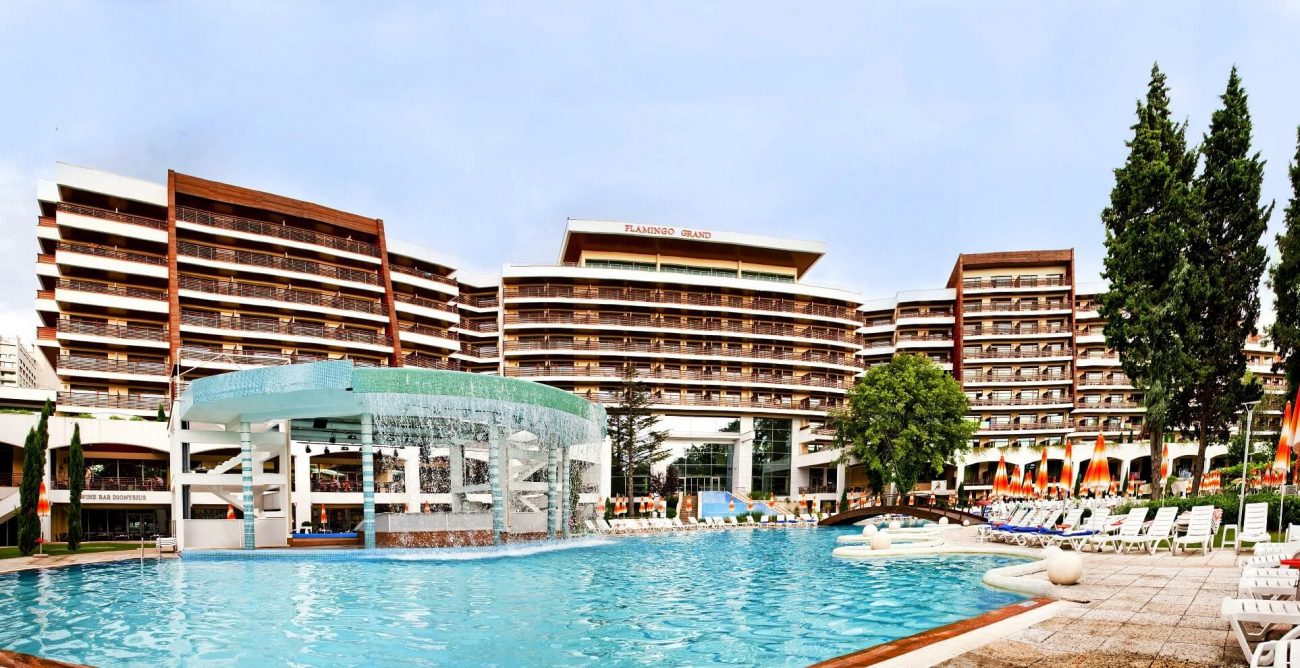 Разположен в сърцето на красивия курорт Албена, петзвездният Фламинго Гранд е едно истинско бижу на българското Черноморие. С изключително модерните си стил и архитектура, хотелът създава приятна атмосфера за релакс и отмора. На разположение на гостите са луксозни студия и апартаменти, а разнообразието от допълнителни удобства и услуги са гаранция за перфектната лятна ваканция.