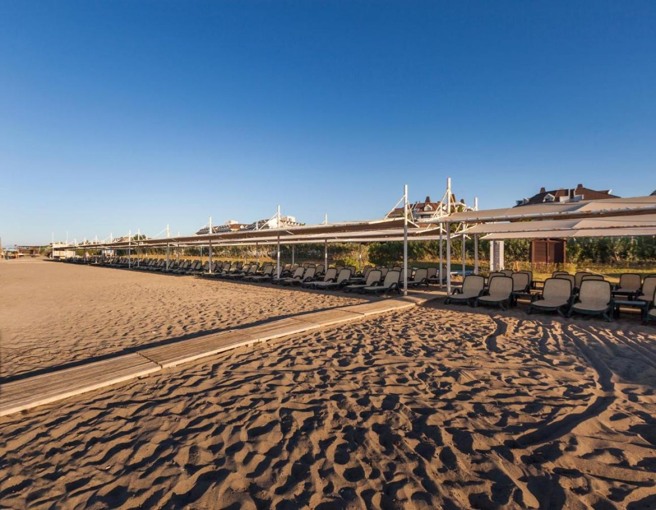 Собствен, пясъчно - чакълест. Чадъри, шезлонги и плажни кърпи на плажа и при басейна – безплатно.