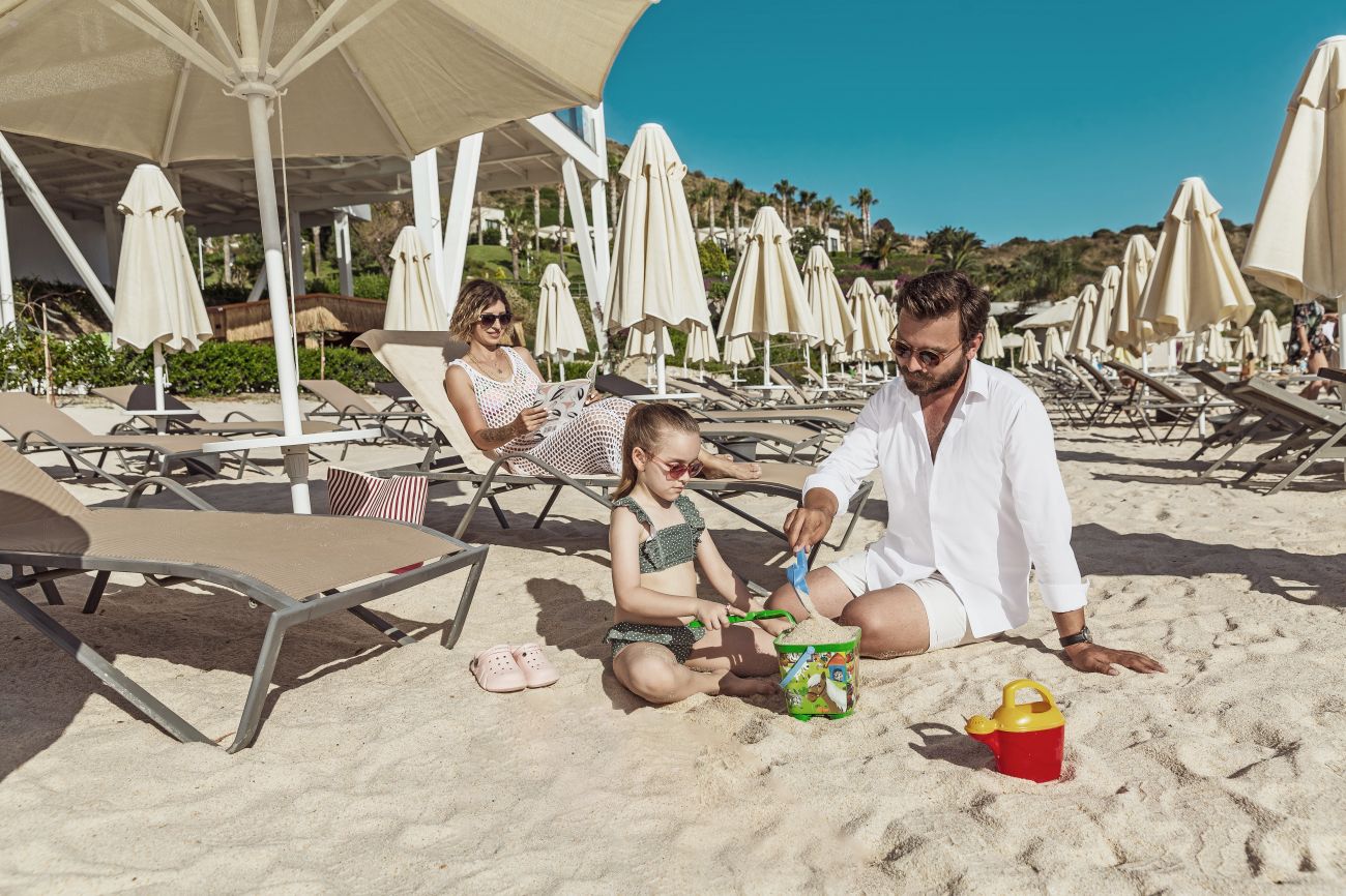 Стаи Main Building: Sea view room (спалня, баня, балкон - 27 м²), Deluxe Room Sea View (спалня, баня, балкон - 36 м²), Standard large room sea view (спалня със зона за сядане, баня, балкон - 34 м²), Junior suite room sea view (спалня със зона за сядане, баня, балкон - 56 м²), Family suite room sea view (2 спални, баня, тераса - 79 м²), Connection room sea view (2 спални с топла връзка, баня, тераса - 54 м²), Superior Suite Swim Up (2-етажна вила с 2 спални, с директен достъп до общ басейн, баня - 180 м²).